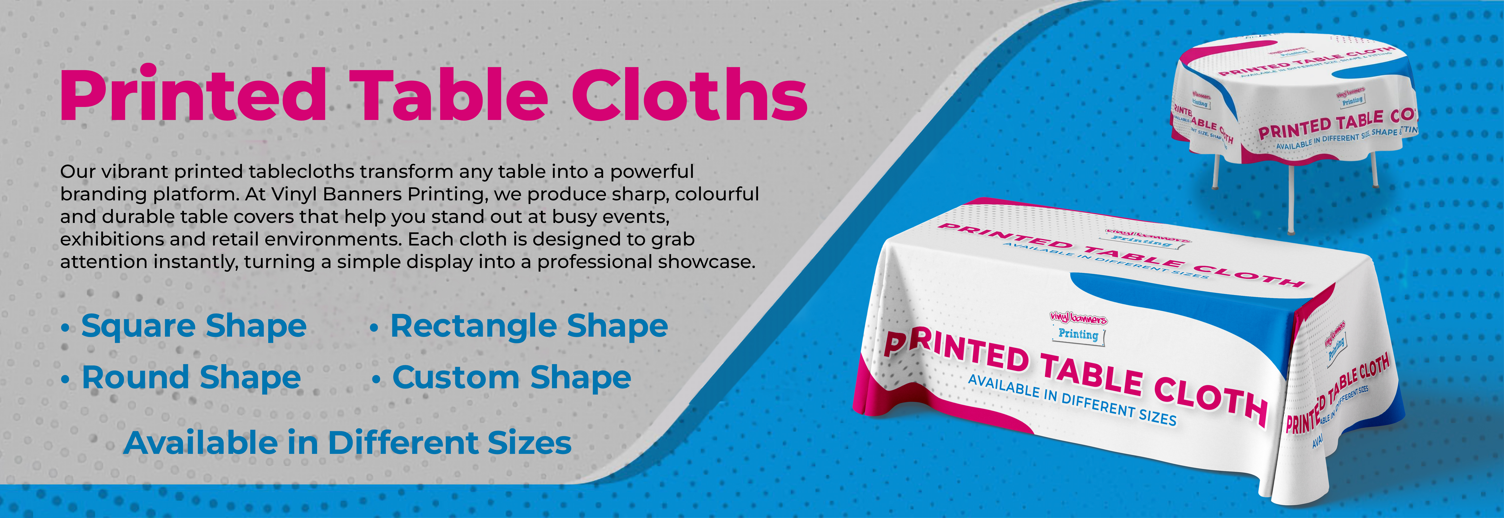 Our vibrant printed tablecloths transform any table into a powerful branding platform. At Vinyl Banners Printing, we produce sharp, colourful and durable table covers that help you stand out at busy events, exhibitions and retail environments. Each cloth is designed to grab attention instantly, turning a simple display into a professional showcase.